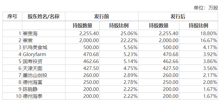按照扒鸡公司招股书,公司次要倡议报酬扒鸡集团、崔贵海等。扒鸡集团由全平易近所有制企业山东扒鸡总公司改制而来。不外,至2010年8月倡议设立扒鸡公司时,崔贵海曾经成为扒鸡集团控股股东,并通过扒鸡集团控股扒鸡公司。