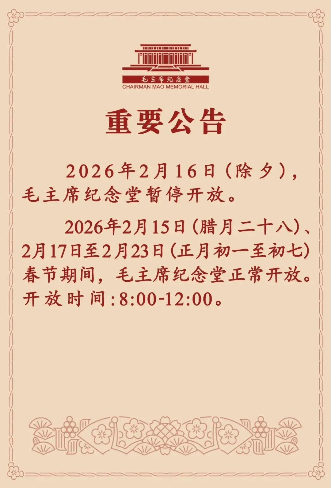 2月10日,毛留念堂号发布主要通知布告:2026年2月16日(大年节),毛留念堂暂停。2026年2月15日(腊月二十八)、2月17日至2月23日(正月初一至初七)春节期间,毛留念堂一般。时间:8:00-12:00。