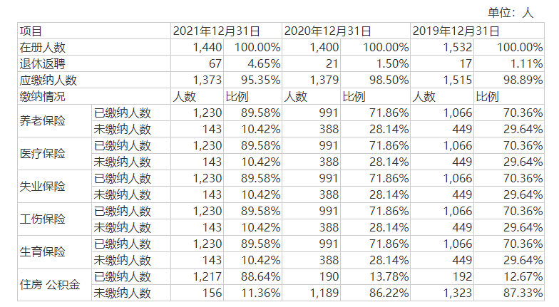 做为家族企业,扒鸡公司办理环境若何?2019年至2021年,公司未缴纳五险人数别离为449人、388人和143人。此中,2019年和2020年未缴纳五险人数比例别离为29。64%和28。14%,2021年该比例降至10。42%。
